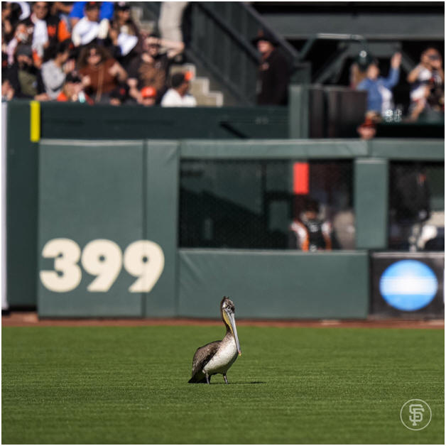 A giant pelican flew onto the field